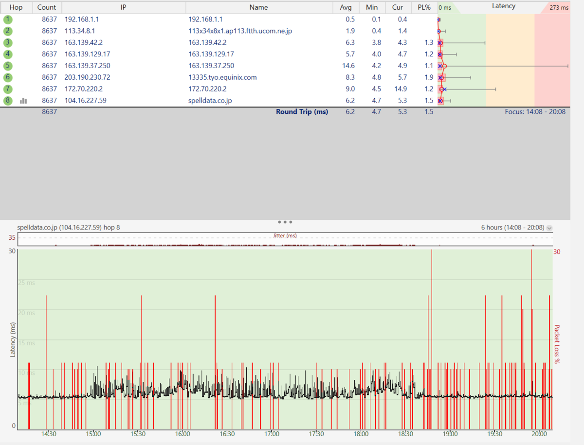 この件について、アルテリア・ネットワークスのサポートが1分ぐらいtracerouteを行って問題無いという結論を出してきたので、長時間の計測でエビデンスを出しました。